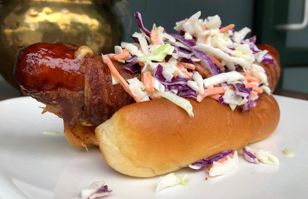 This new Deliverance Dog creation features bacon-wrapped sausage with coleslaw, paired with rosemary French fries. Sage is donating proceeds from the sausage to its staff. (Top picture of Deliverance Dog, Sage),
