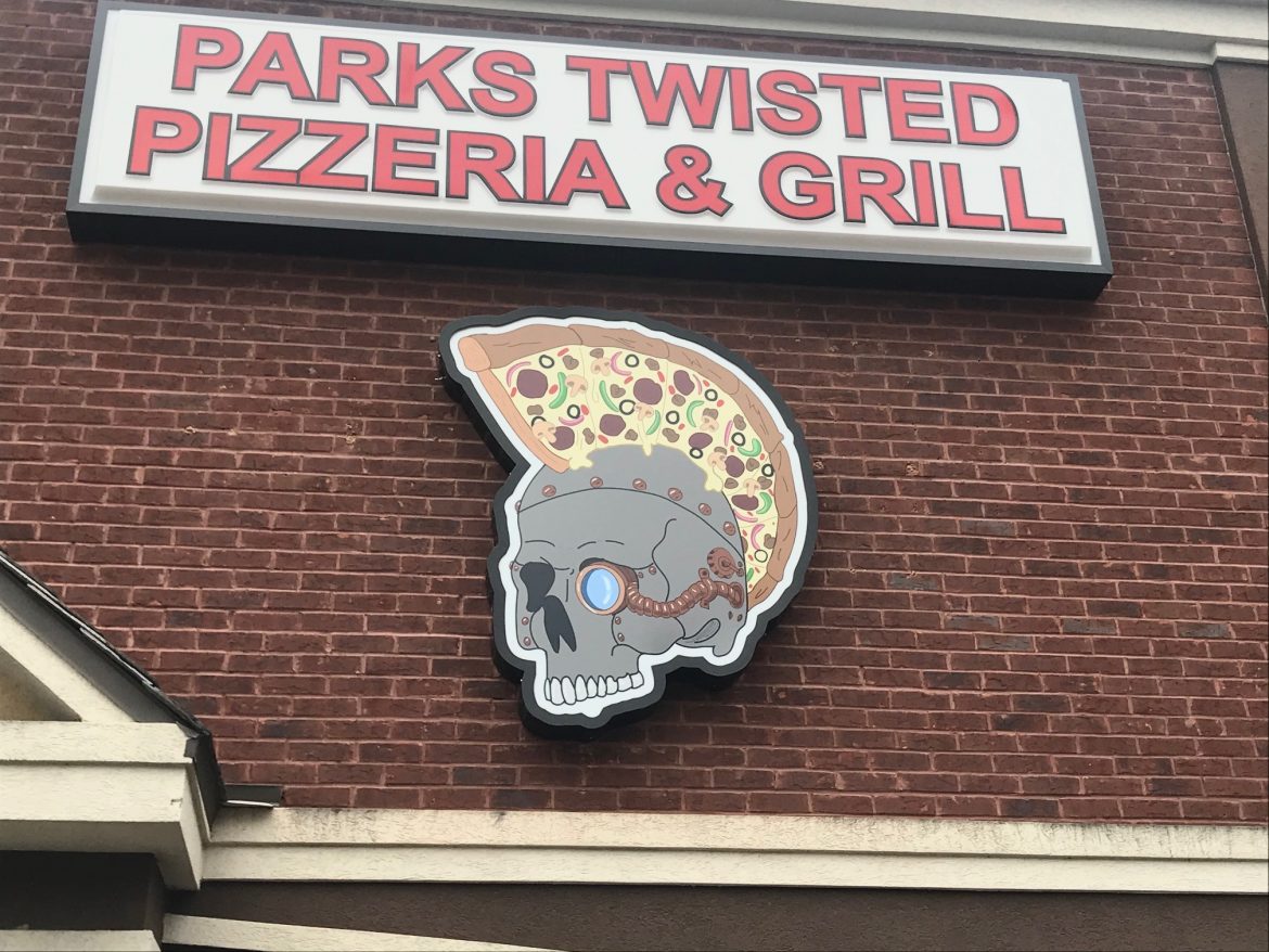 The “twisted” part in the restaurant’s name, Josh said, refers to the twisted gears on display as part of the venue’s steampunk decor, which sounds pretty cool. It will feature rustic accents and metal works. One side of the restaurant will be all brick. The new sign, made by Josh’s sister, Allison, is now up at the new location showing a skull imposed on a pizza.